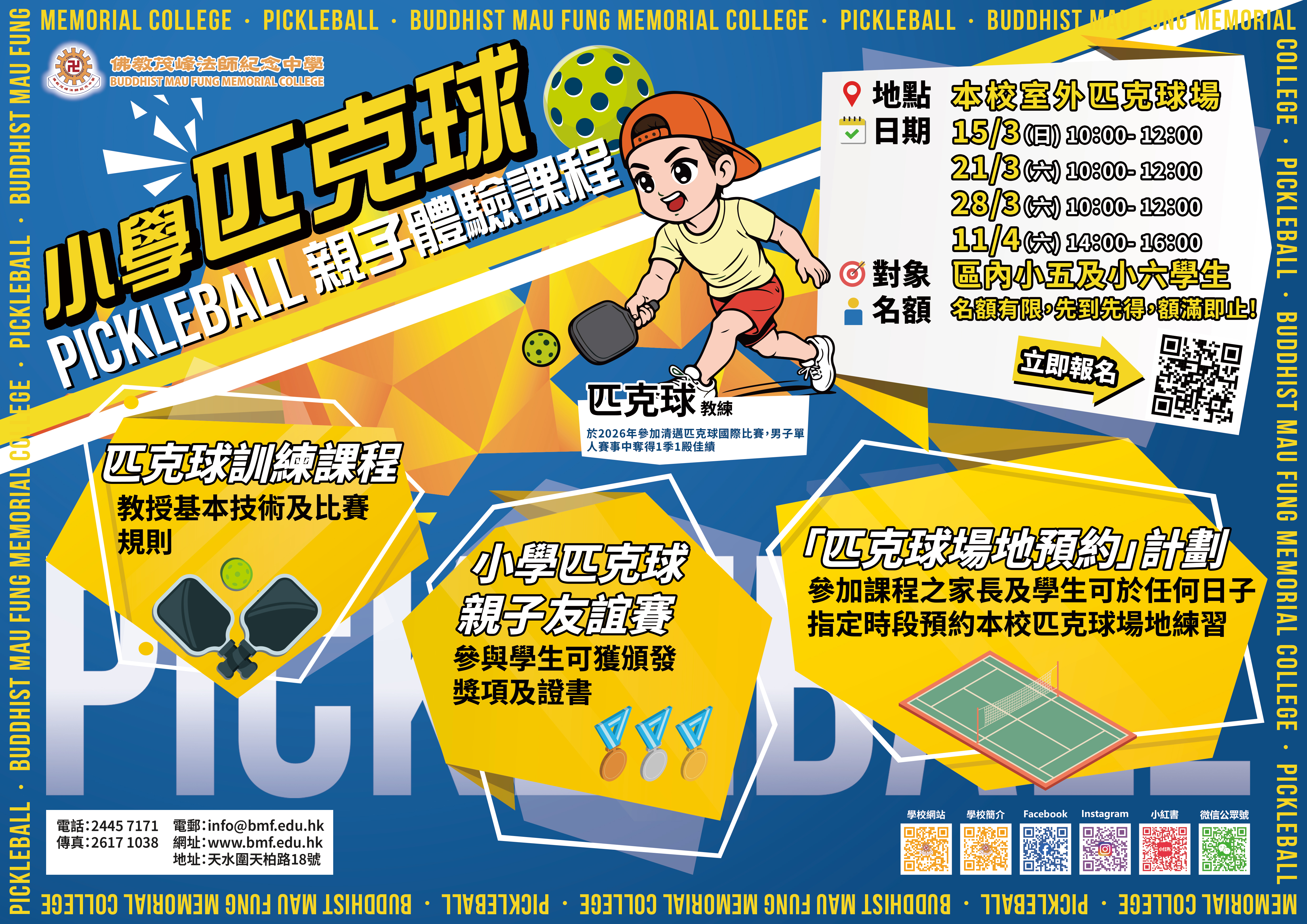 佛教茂峰法師紀念中學誠邀區內小五及小六學生及家長,一同參加充滿活力的親子匹克球活動!