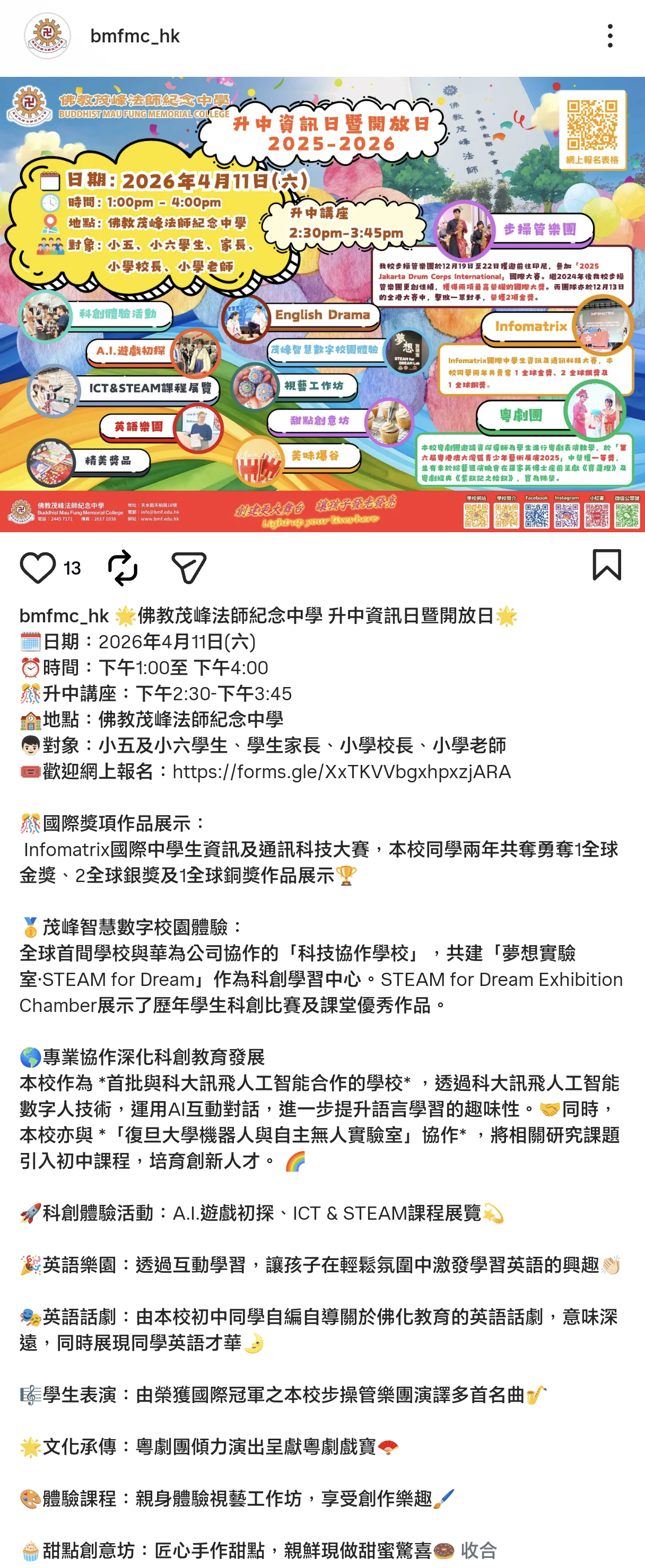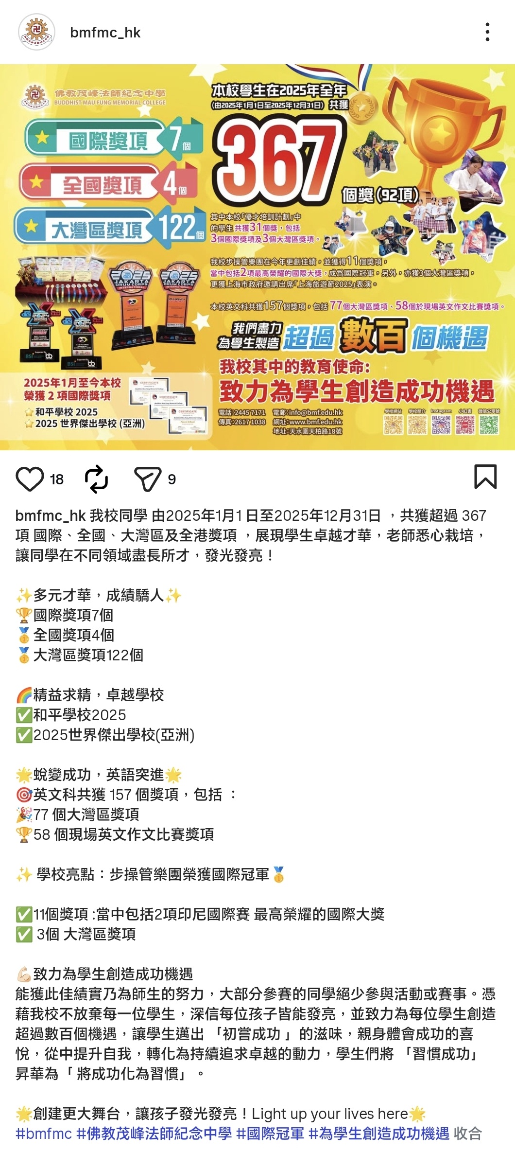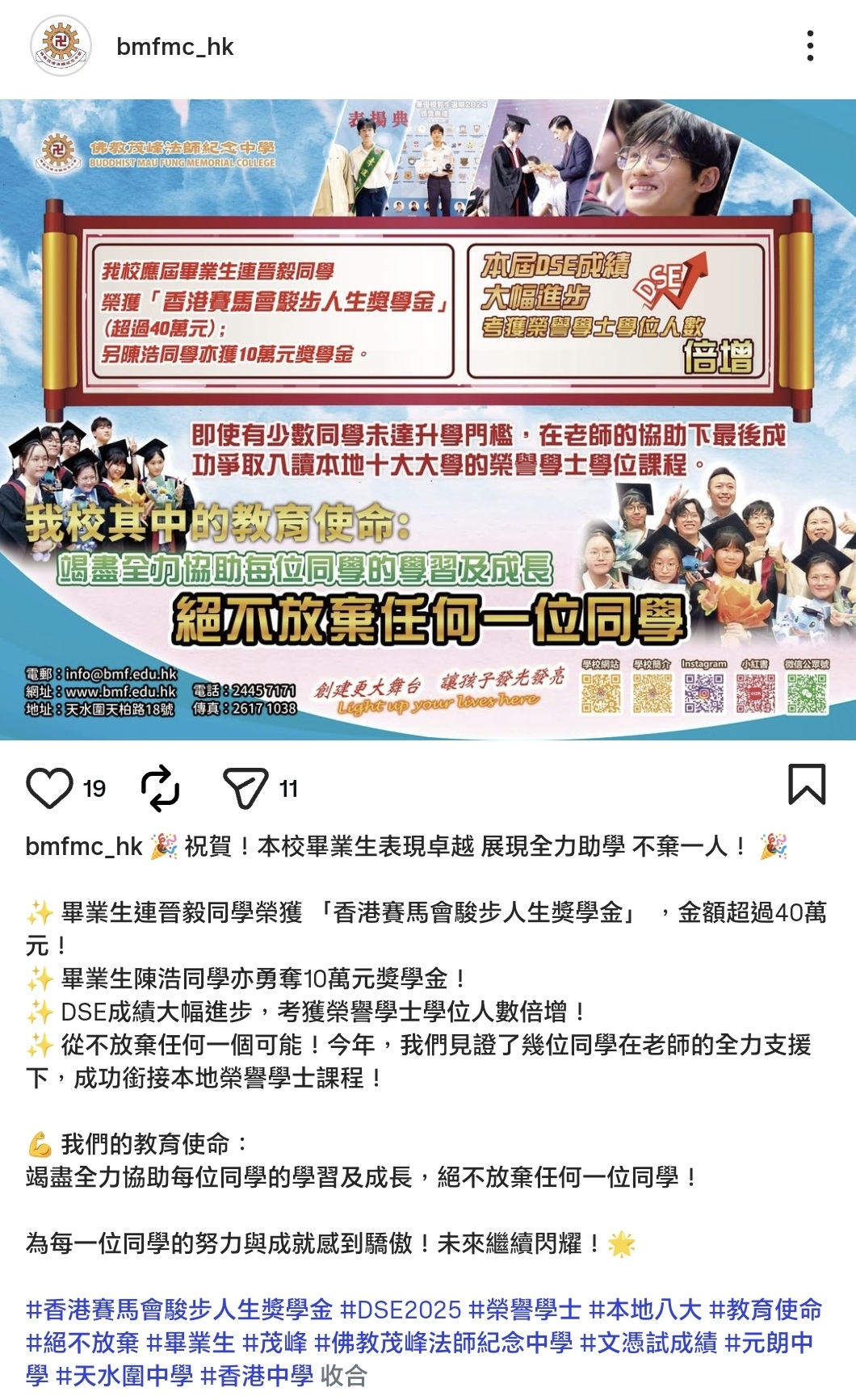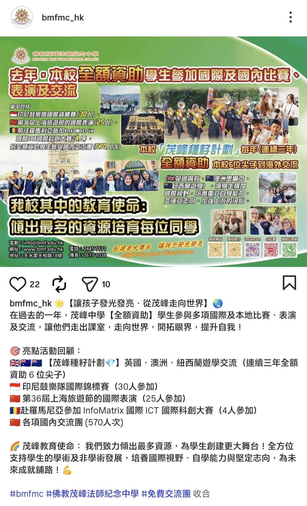 佛教茂峰法師紀念中學 官方小紅書帳號 BMFMC_HK