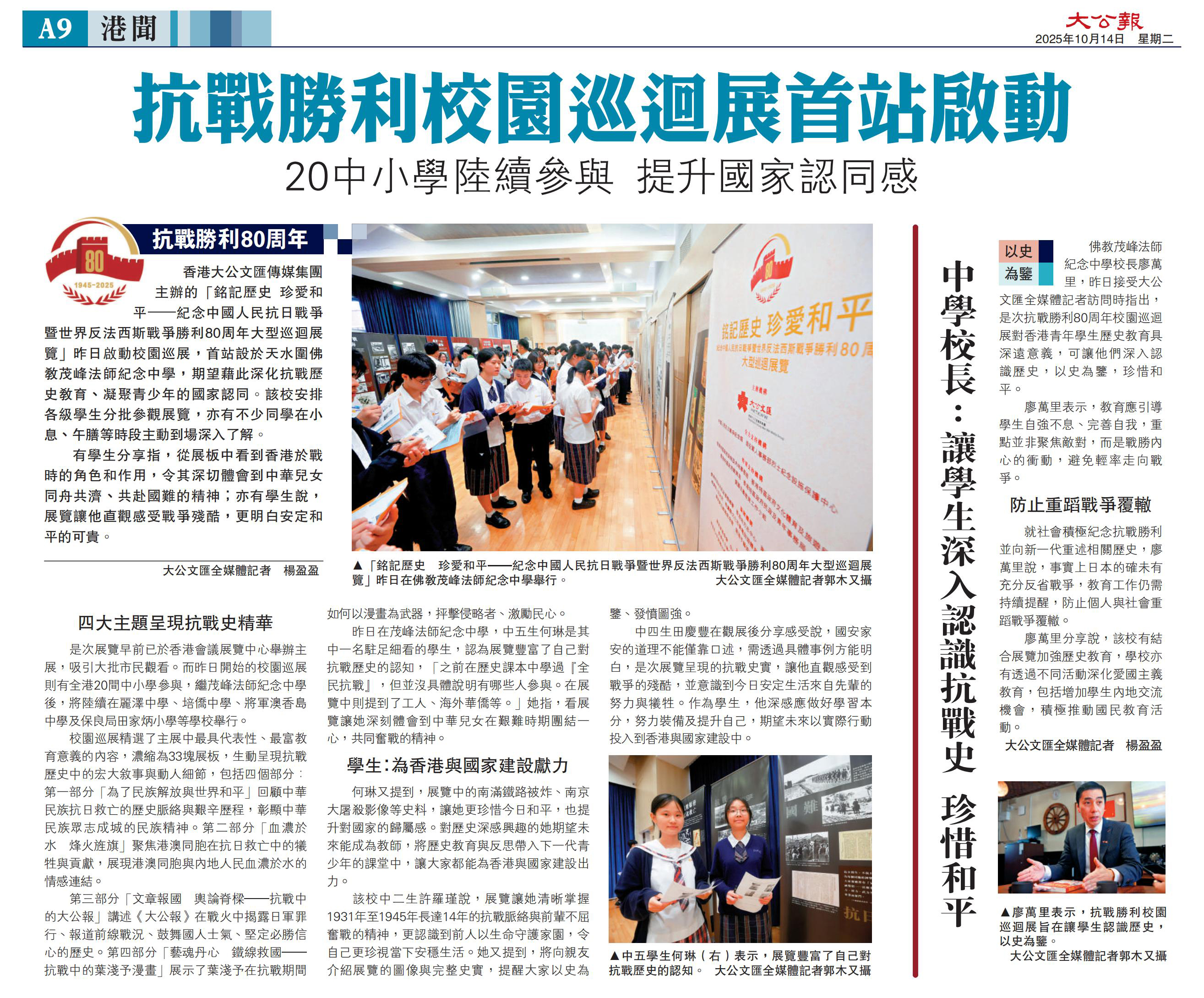 (大公文匯全媒體 記者 楊盈盈)為紀念中國人民抗日戰爭暨世界反法西斯戰爭勝利80周年,香港大公文匯傳媒集團策劃主辦「銘記歷史 珍愛和平——紀念中國人民抗日戰爭暨世界反法西斯戰爭勝利80周年大型巡迴展覽」,主展已於8月22日至8月29日於香港會議展覽中心順利舉辦。為進一步推動抗戰歷史教育走進社區與校園,凝聚香港青少年的國家認同,主展精華內容正於全港18區及部分大中小學巡迴展出。