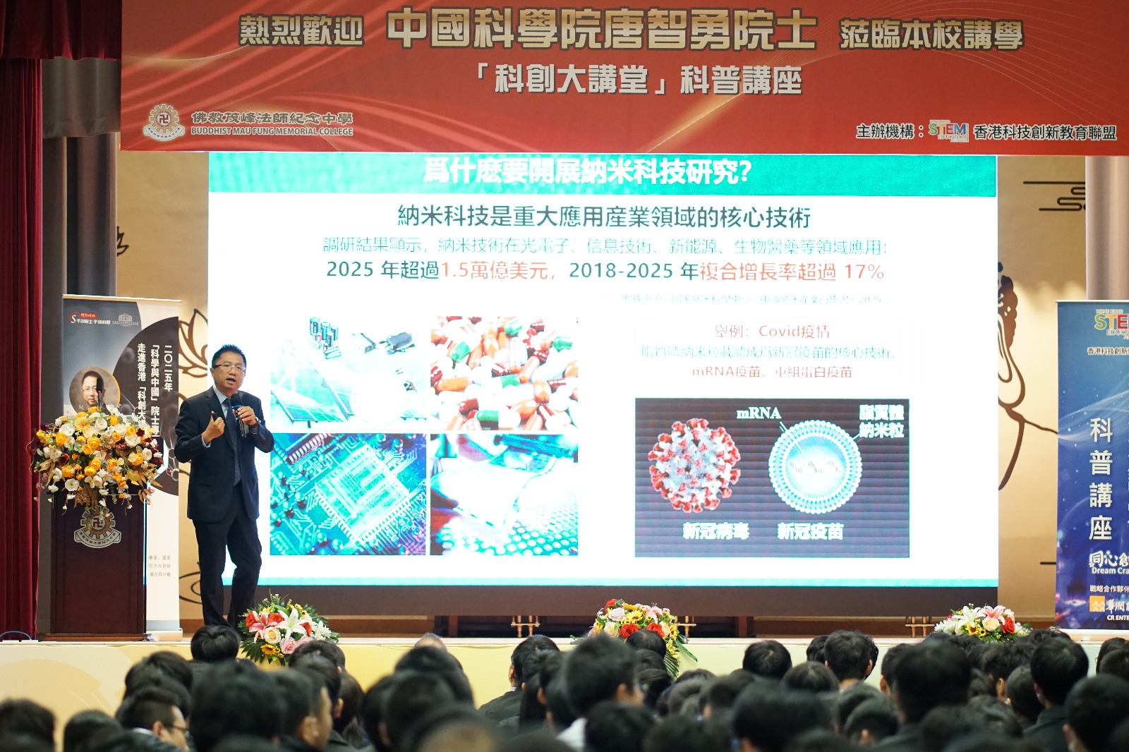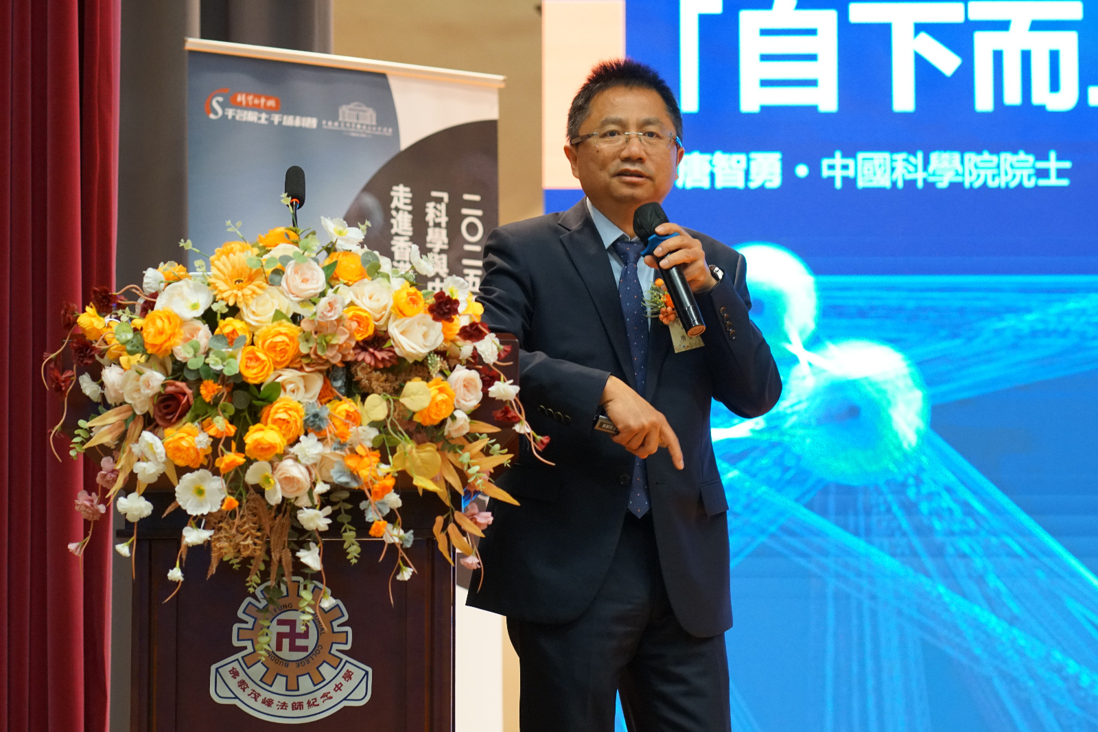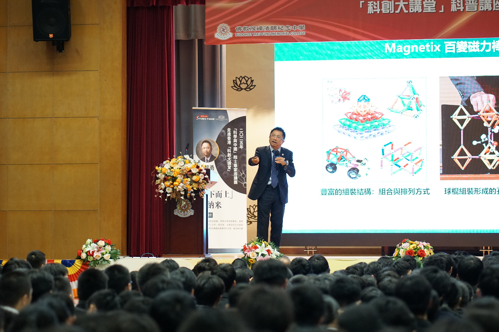 本校很榮幸於12月3日邀得中國科學院院士,國家納米科學中心研究員,科技部納米重大研究計劃首席科學家唐智勇院士親臨講學,其主要研究方向是納米自組裝材料的構建及其獨特的光學、催化與分離性質。唐院士以「自下而上」談納米為講題,為我們深入淺出講解納米科學與技術中所涉及的基本物理化學原理、納米材料的製造與表徵方法、使用場景、並帶領同學思考未來發展方向,啟發同學對納米科技的好奇心與探索興趣,為同學帶來一場精彩的科普講座。