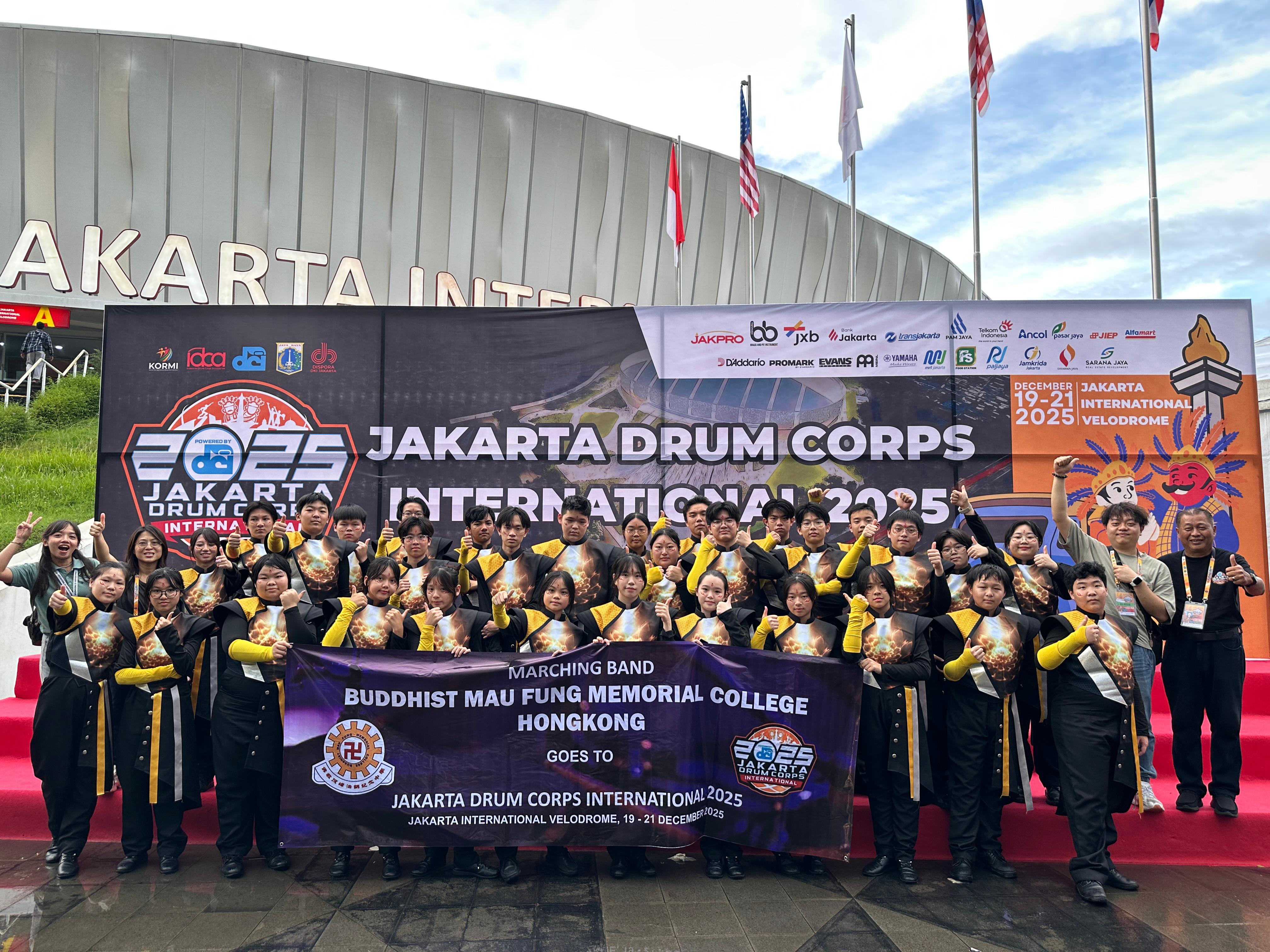 我校 步操管樂團 獲邀參加印尼舉行的「2025 Jakarta Drum Corps International」國際大賽,於12月19日 至 12月22日 在印尼亞加達舉行。經領隊陳杏芝老師的努力栽培、導師們的悉心教導及團隊同學的同心努力下,繼 2024年後,再次獲得兩項國際大獎,包括「International Band (Senior Class) Sound Sport Best Performance Award」及「International Band (Senior Class) Street Parade Best Performance Award」。