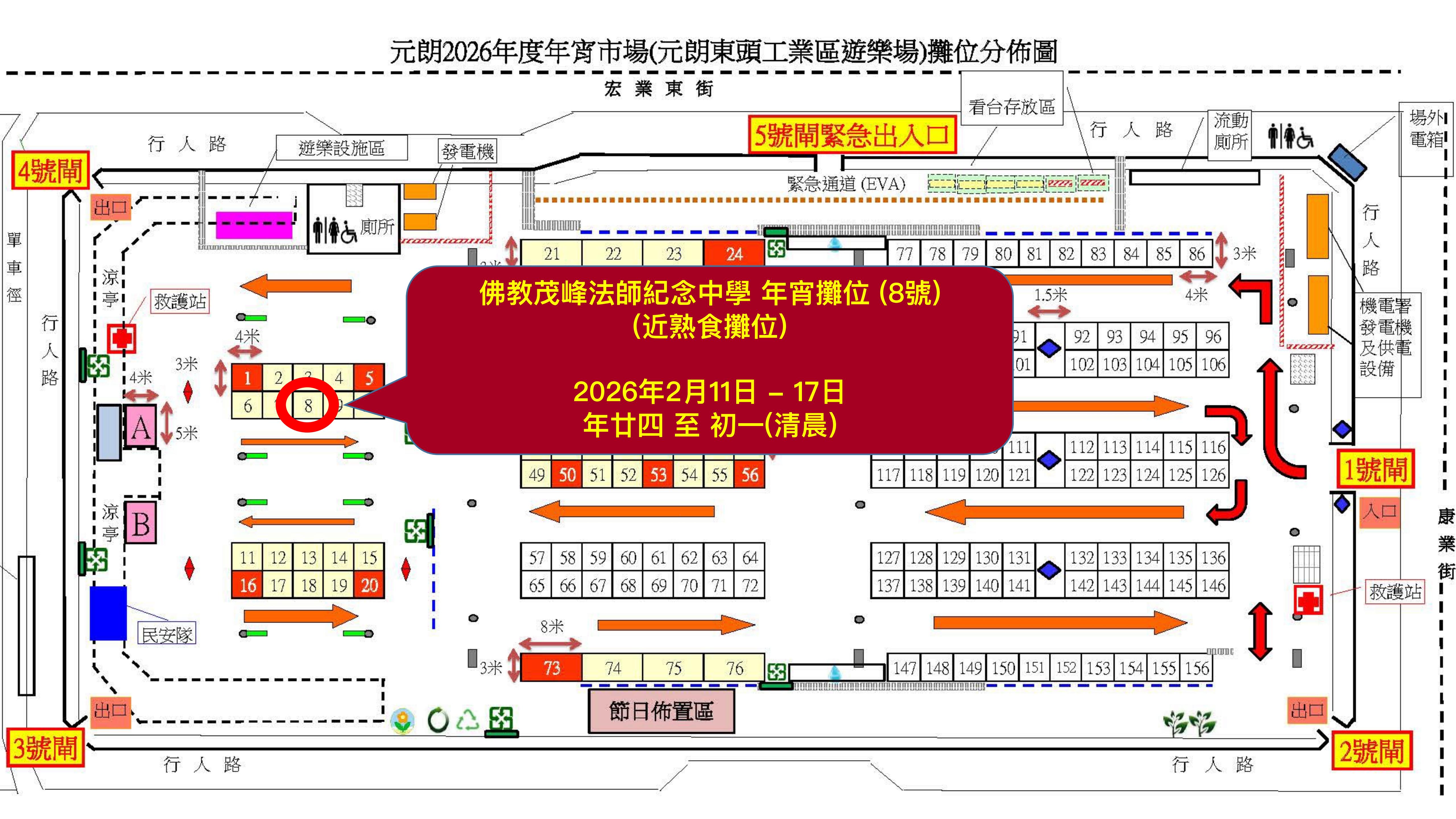 元朗2026年度年宵市場(元朗東頭工業區遊樂場)8號舖。(熟食攤位附近,詳見附件地圖)