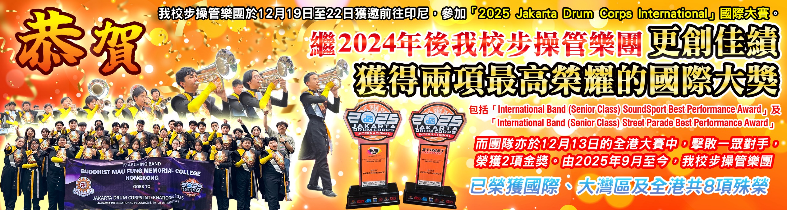 - 2025-12-22 我校步操管樂團參加「2025 Jakarta Drum Corps International」國際大賽再次獲得兩項國際大獎